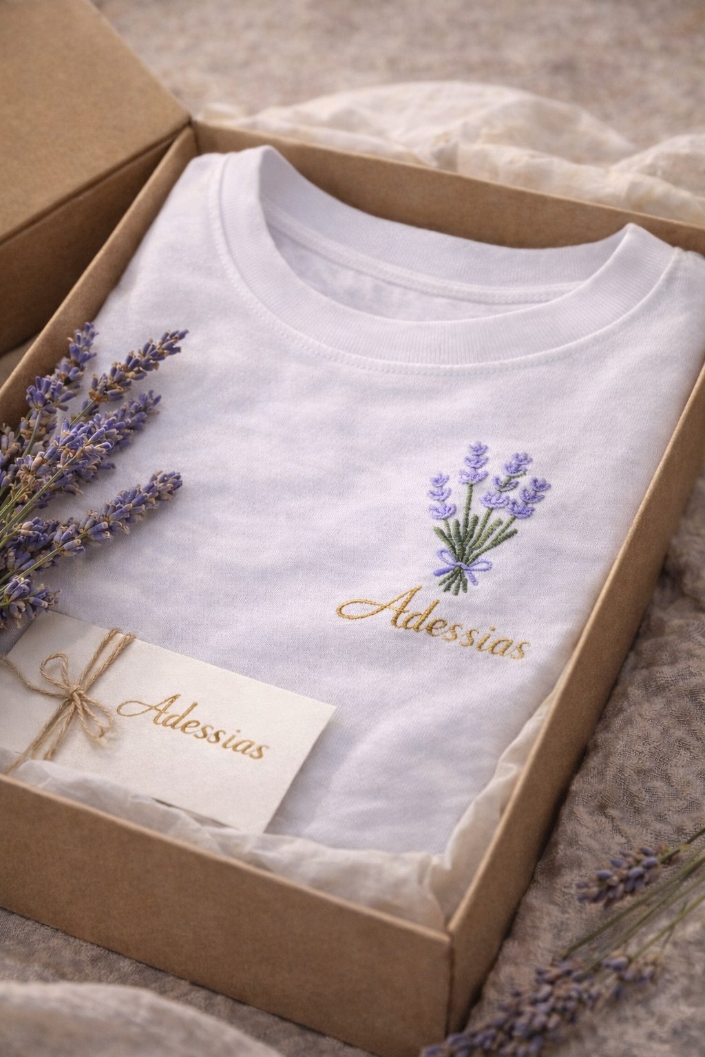 De la broderie au pliage, chaque pièce est préparée avec soin dans notre atelier. Votre T-shirt Adessias arrive comme un objet précieux, prêt à être porté...ou offert.